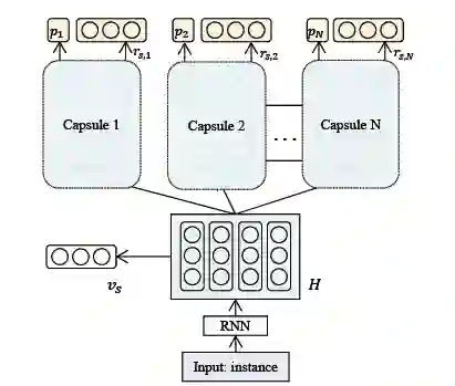 RNN-Capsule首先使用RNN捕捉文本上下文信息,然后将其输入到capsule结构中,该capsule结构一共由三部分组成:representation module, probability module,和reconstruction module。具体地,首先用注意力机制计算capsule 表征;然后用capsule表征计算capsule状态的概率;最后用capsule表征以及capsule状态概率重构实例的表征。