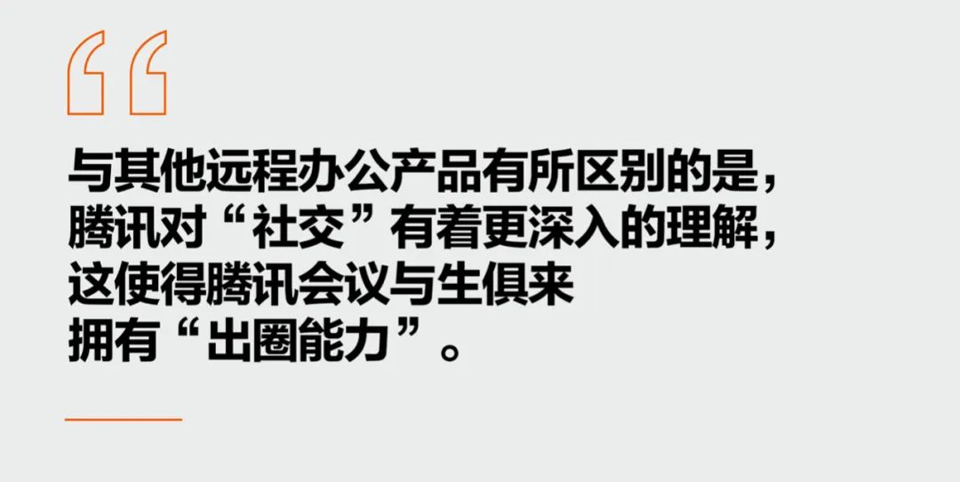 与其他远程办公产品有所区别的是,腾讯对“社交”有着更深入的理解,这使得腾讯会议与生俱来拥有“出圈能力”。