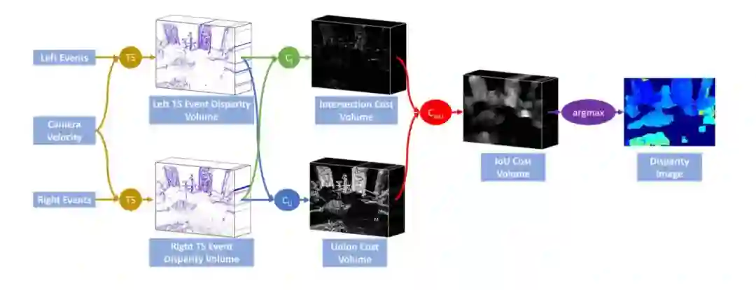 本文提出了一种新的基于事件的立体方法,解决了运动事件相机的运动模糊问题。本文提出的方法使用摄像机的速度和一定范围的视差来同步事件的位置,使得它们就好像是在一个时间点被捕获的。使用了一对新的时间同步事件视差量来表示这些事件,并且展示了在正确视差的情况下为像素移除运动模糊,而在错误视差的情况下进一步模糊像素。然后在这些同步事件视差量上应用了一种新的匹配代价函数,它既奖励了这些视差量之间的相似性,又惩罚了模糊性。最后通过对多车辆立体事件摄像机数据集的评估,表明本文的方法优于更耗资源的基于平滑的事件立体方法。