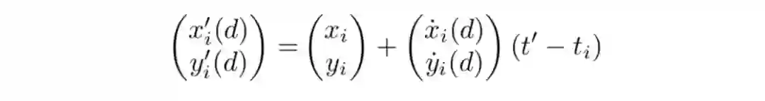 假设每个像素的光流在每个时间窗内是恒定的,那么可以使用线性插值法估计在恒定时间t'产生事件(xi,yi,ti,pi)的点的位置: