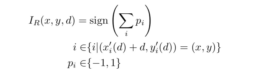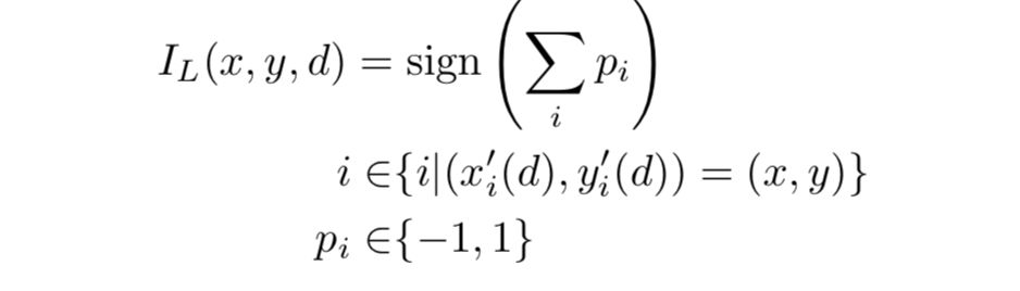 在每个视差水平d,基于时移事件生成图像,其中具有更多正事件的像素被设置为1,更多负事件被设置为-1,没有事件被设置为0。注意,需要将时移事件位置取整到最接近的整数索引到图像中。