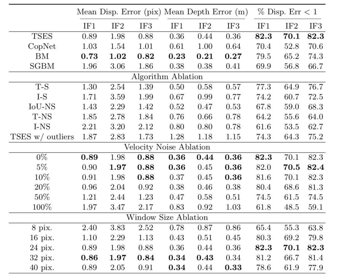 表1:测试TSES(本文的方法)和CopNet的室内飞行(IF)序列以及消融研究的定量结果。 算法消融的前缀:IoU-联合成本,I-交叉成本,T-时间成本。 后缀代表的是(S)有和(NS)没有时间同步。 速度噪声分别加到线速度和角速度上,作为零均值高斯噪声,方差为每个速度范数的百分比。