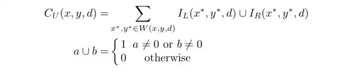 最后,作者应用了一种新颖的滑动窗口匹配代价,同时利用了部分1的去模糊和模糊效果。首先,它惩罚有许多事件的窗口,这将找到由于时间插值引起的模糊而具有不正确视差的区域。 给定在给定视差d处的像素(x,y)周围的局部空间窗口W(x,y,d),使用联合项对其进行编码,定义为: