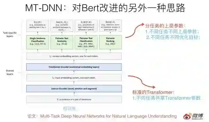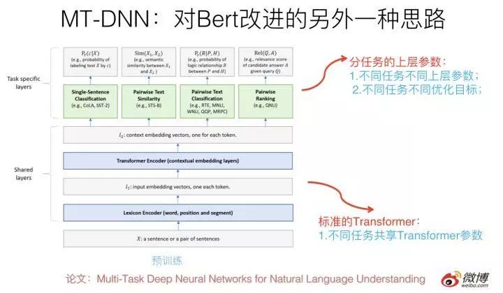 这种做法一个典型的模型是最近微软推出的 MT-DNN,改进思路就如上所述,可以参考上图示意。核心思想如上,结构上底层就是标准的 Bert Transformer,在上层针对不同任务构造不同优化目标,所有不同上层任务共享底层 Transformer 参数,这样就强迫 Transformer 通过预训练做很多 NLP 任务,来学会新的知识,并编码到 Transformer 的参数中。