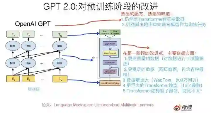 那么 GPT 2.0 本质上是怎么做的呢?最大的改进是什么?其实几句话就能说明白,就是上图写的内容。