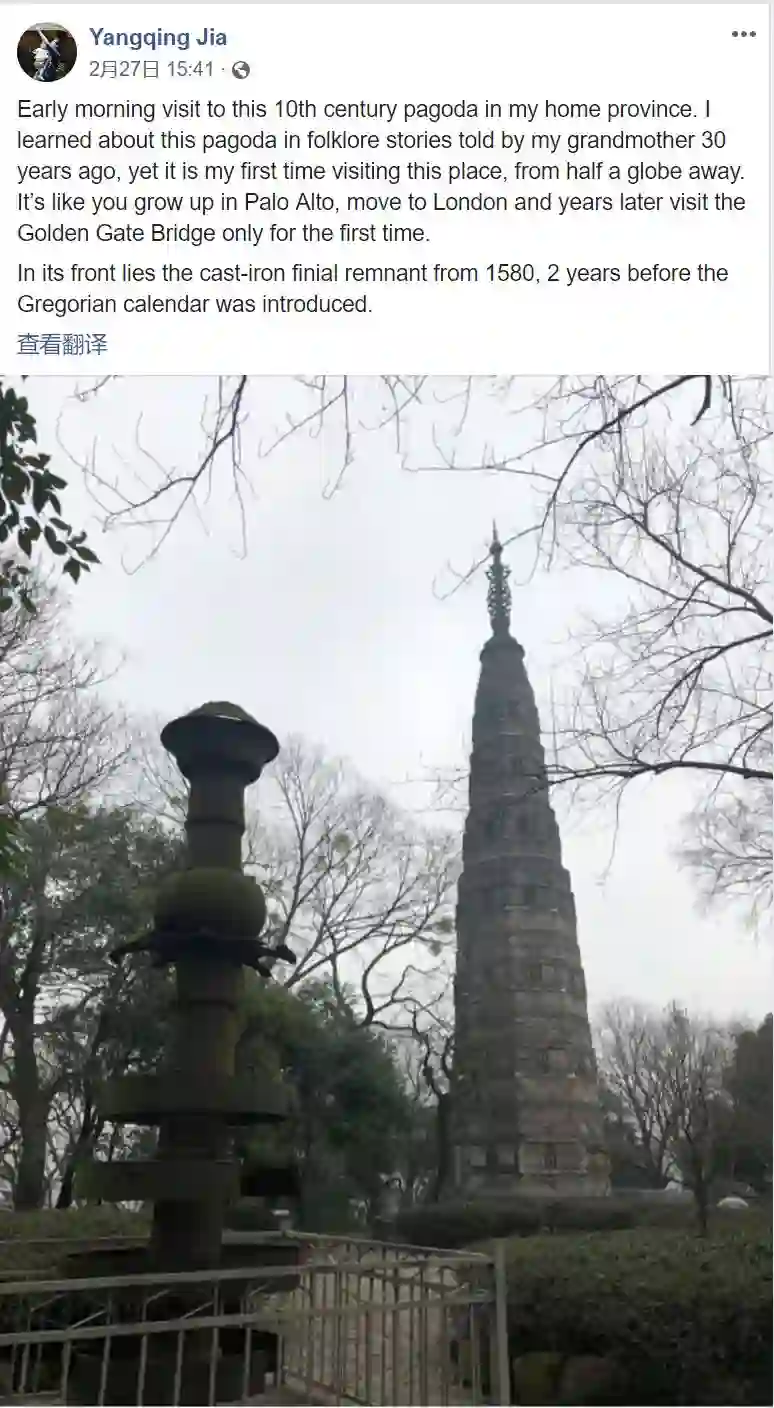 贾扬清在Facebook最新一篇文章中分享了游览杭州保俶塔