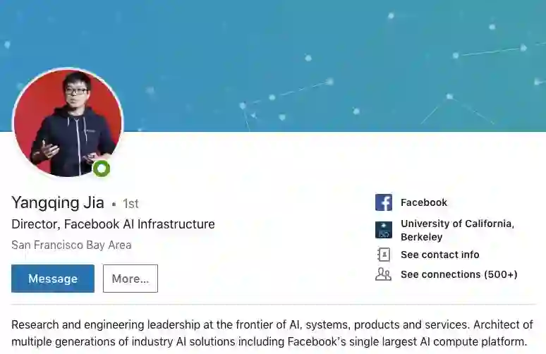 根据贾扬清LinkedIn页面介绍,他加入Facebook后,创建、发展和分拆了多个团队,现在统称为Facebook AI架构组 (Facebook AI Infrastructure)。