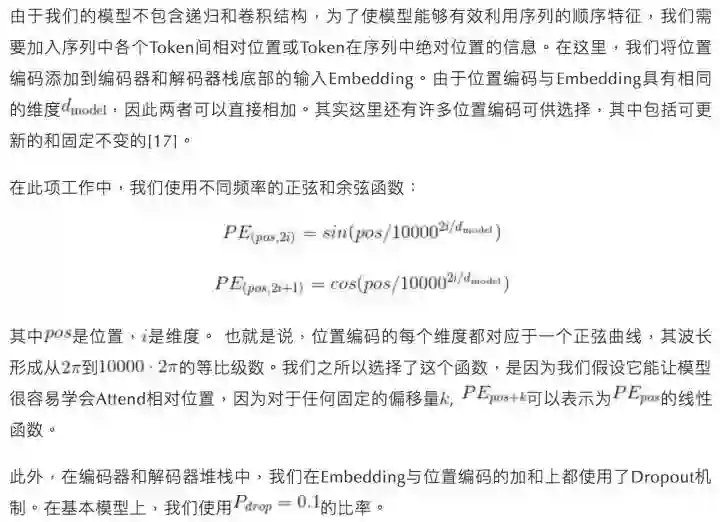 我们也尝试了使用预学习的位置Embedding,但是发现这两个版本的结果基本是一样的。我们选择正弦曲线版本的实现,因为使用此版本能让模型能够处理大于训练语料中最大序了使用列长度的序列。