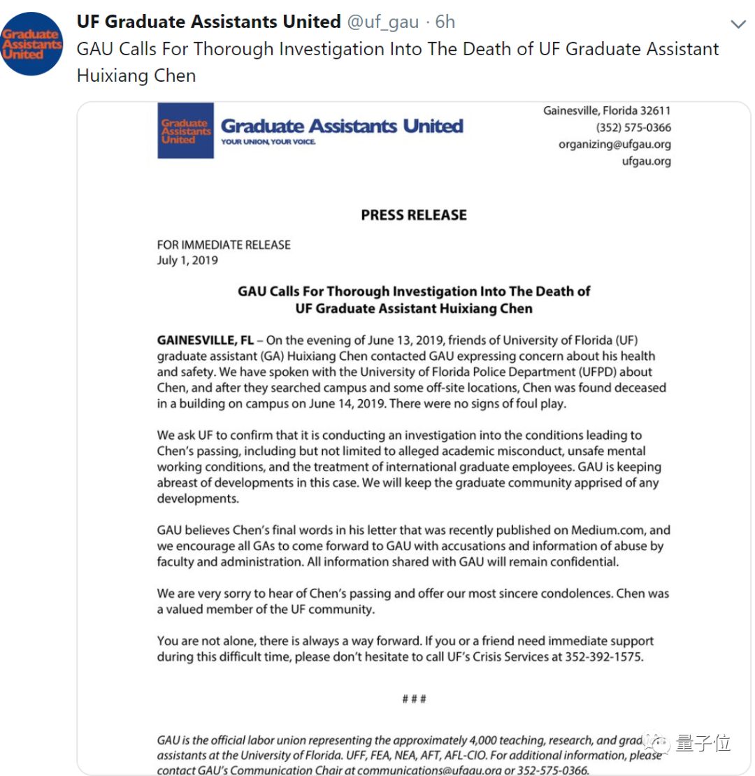佛罗里达大学的工会组织Graduate Assistants United也发表声明称,密切关注此次,呼吁彻查Huixiang Chen去世及其背后的原因。