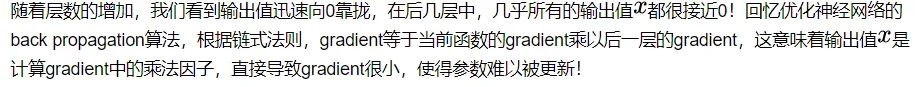 背景:由于Internal Covariate Shift(Google)效应,即深度神经网络涉及到很多层的叠加,而每一层的参数更新会导致上层的输入数据分布发生变化,通过层层叠加,高层的输入分布变化会非常剧烈,这就使得高层需要不断去重新适应底层的参数更新。为了训好模型,我们需要非常谨慎地去设定学习率、初始化权重、以及尽可能细致的参数更新策略。也就是随是着网络加深,参数分布不断往激活函数两端移动(梯度变小),导致反向传播出现梯度消失,收敛困难。