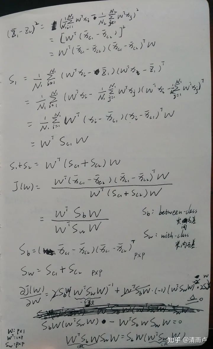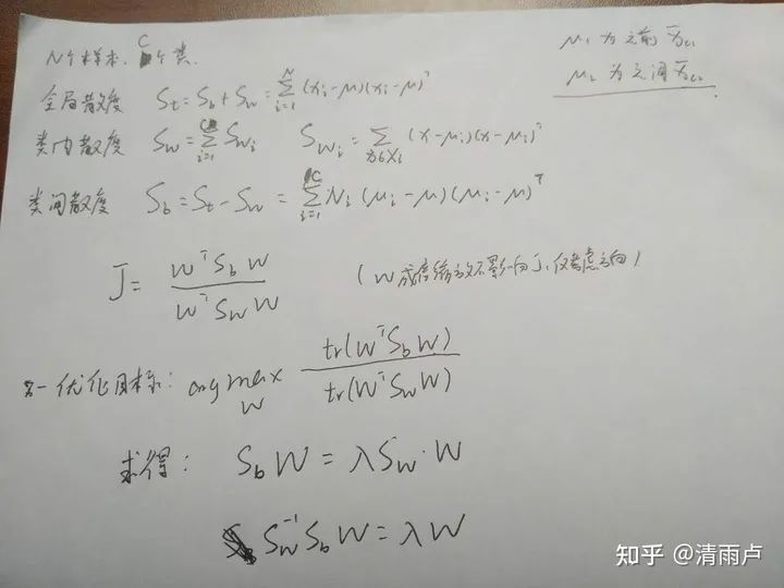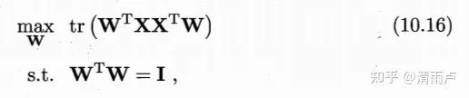 用最大可分性来推导,就是使得投影后的样本的方差尽可能大,两种方式都可以得到下式:(tr表示矩阵的迹,即矩阵主对角线元素的和,也等于矩阵所有特征值的和)
