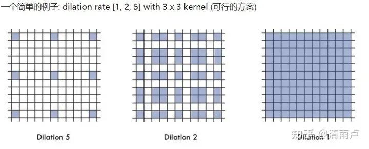 第二个特性是,我们将 dilation rate 设计成 锯齿状结构,例如 [1, 2, 5, 1, 2, 5] 循环结构。
