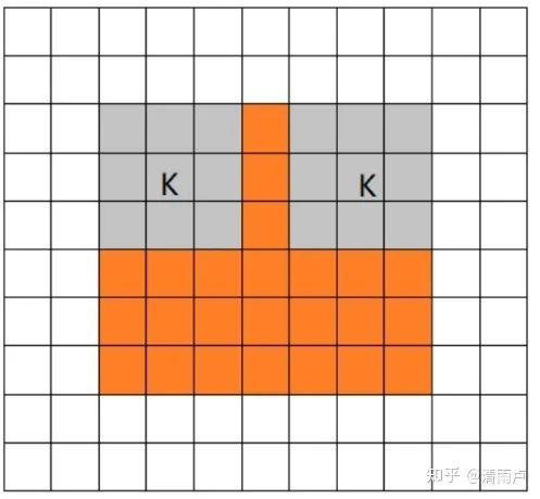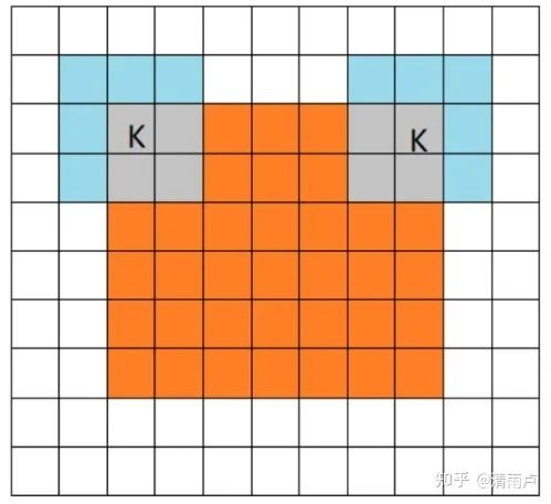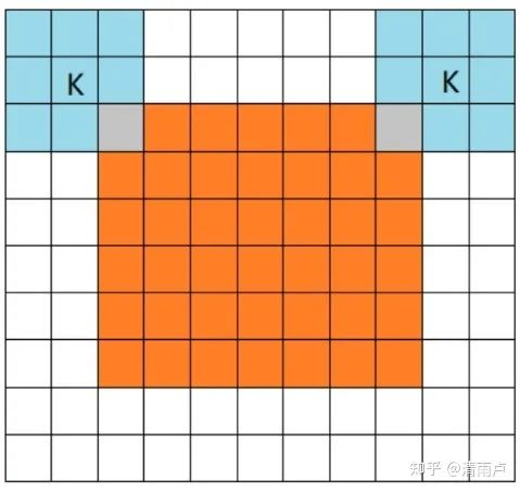 当filter的中心(K)与image的边角重合时,开始做卷积运算,可见filter的运动范围比full模式小了一圈。注意:这里的same还有一个意思,卷积之后输出的feature map尺寸保持不变(相对于输入图片)。当然,same模式不代表完全输入输出尺寸一样,也跟卷积核的步长有关系。same模式也是最常见的模式,因为这种模式可以在前向传播的过程中让特征图的大小保持不变,调参师不需要精准计算其尺寸变化(因为尺寸根本就没变化)。