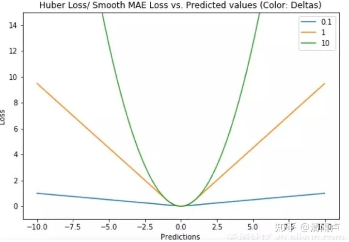 使用超参数δ来调节这一误差的阈值。当δ趋向于0时它就退化成了MAE,而当δ趋向于无穷时则退化为了MSE