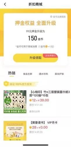 2019年3月,ofo又上线了折扣商城,引导用户将99元押金升级为150金币、199元押金兑换300金币用于购物,然而“现金+金币”的支付模式决定了用户想要买东西还需另外付费。