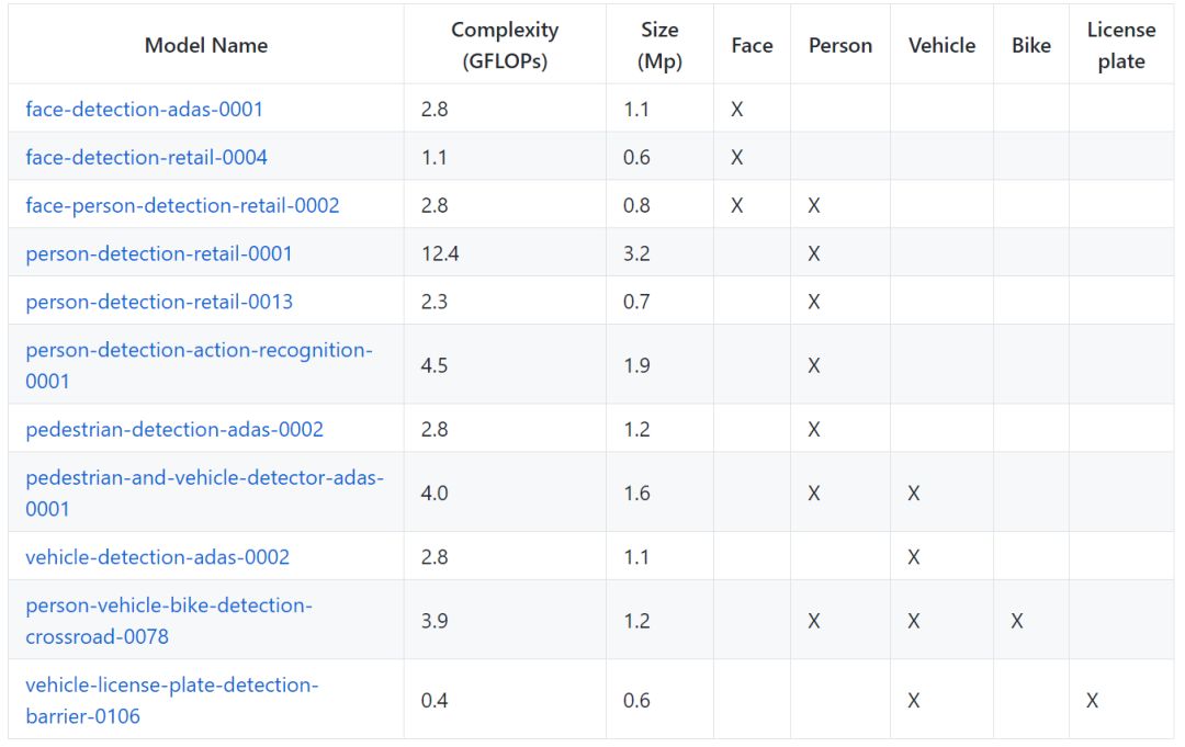 有几种检测模型可以用于检测一系列最常见的目标。大多数网络都是基于 SSD 并提供了合理的准确率/速度权衡。这个列表有人脸、人物、汽车、自行车等目标的检测模型,其中包含一些检测相同类型的目标的网络(例如 face-detection-adas-0001 和 face-detection-retail-0004),因而你可以选择更高准确率/更广泛应用的网络,但同时存在更慢推理速度的代价。