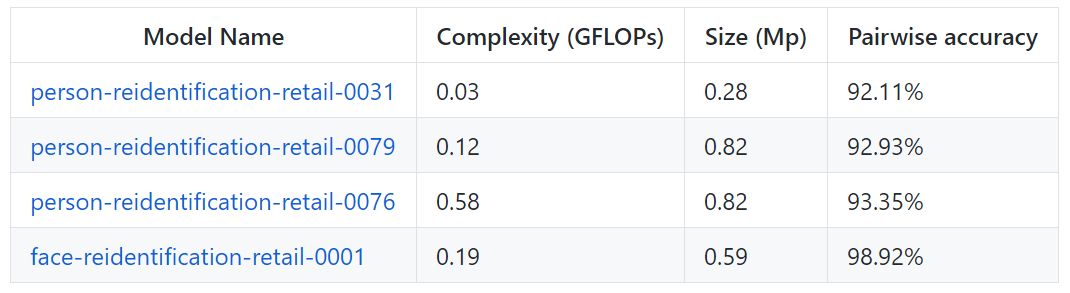 视频中进行目标的精确追踪是计算机视觉的常见应用(例如,人群计数)。以下网络可以用于这样的场景。输入一个人的图像并估计一个表征该人物外观的高维向量。这个向量可以用于进一步评估:对应同一个人的图像会有很接近的向量(基于 L2 距离指标)。以下列表提供了不同准确率/速度权衡的模型选择。列表中包含了人物和人脸再识别任务的模型。