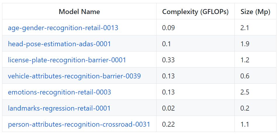 目标识别模型被用于分类、回归和特征识别。可以在使用检测模型之后使用这些网络(例如,在人脸检测之后使用年龄/性别识别)。这个列表包含了年龄/性别、头部姿态、车牌号码、汽车属性、情绪、人脸关键点和人物属性等目标的识别模型。