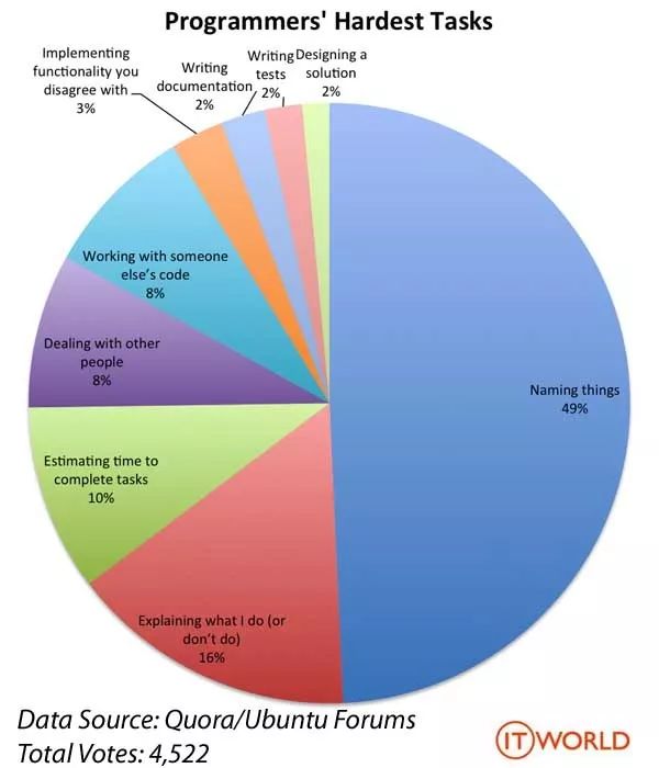 ITWorld 曾经发起过一个“程序员最头疼的事情”投票,结果,近半数的程序员认为命名是最头疼的事情。