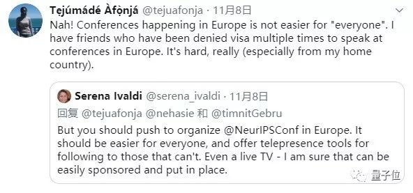连访问目的都是错,这太可笑了。Tejumade Afonja申请加拿大签证,是要前往参加机器学习顶会NeurIPS,而且她还是大会一个Workshop(ML4D)的联合组织者。一场学术活动的组织者,最后不能参加自己组织的活动,呵呵。
