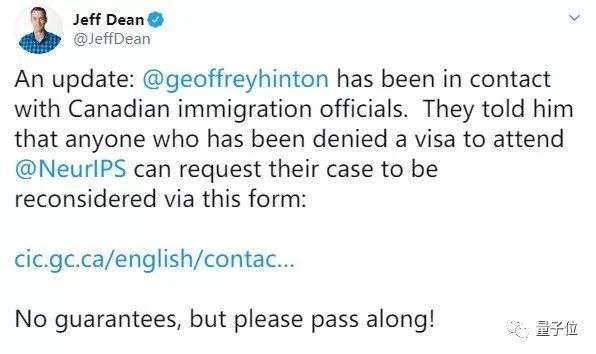 据Jeff Dean透露,图灵奖得主、深度学习三巨头之一、现居加拿大的著名学者Geoffrey Hinton,已经亲自过问此事。加拿大官员告诉Hinton,被拒签的NeurIPS参会者,可以在网上申诉。不过……
