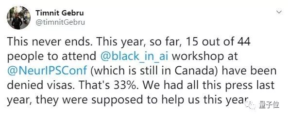 Google的研究学者Timnit Gebru公布了一个数据:截至目前,他邀请了44人前往出席NeurIPS的另一个Workshop(Black in AI),其中15人被加拿大拒签,拒签率三分之一。