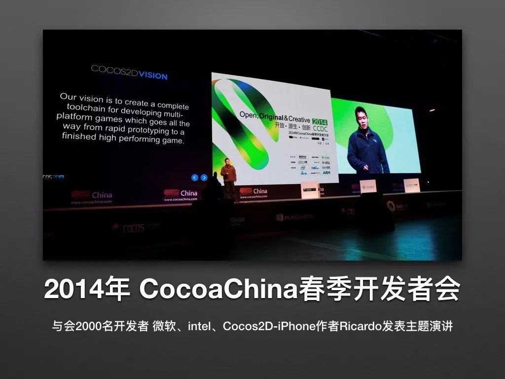 2014年春季,我们在游戏研发、游戏引擎占有率、游戏发行业务都是行业的领先地位,我们当年的开发者会有很多国际企业参与包括微软、intel等等,当年Cocos2D-iPhone的作者Ricardo也已经正式加入引擎团队。对于Cocos2D-X他曾经不是那么认可,但是他的加入也说明他对于我们努力的认可。