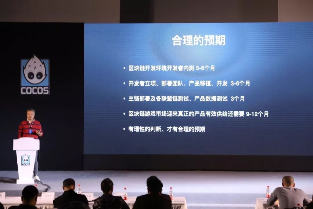 合理的预期非常重要。合理的预期包括我们认为区块链开发者拿到今天真正发布的测试环境,我们给开发商的内测版本,开发者部署团队、产品移植、开发,到主链部署及各联盟链测试,产品数据测试3个月,区块链游戏市场迎来真正产品有效供给还需要,期待上市或者常态化推出,由研发团队,有目标、有数据支撑至少9到12个月,有理性的判断才能有理性的预期,今天看到整个市场上非常多满天飞的信息,对区块链的憧憬,新技术的憧憬,还有炒币暴富的文化,我们还需要理性的看待。