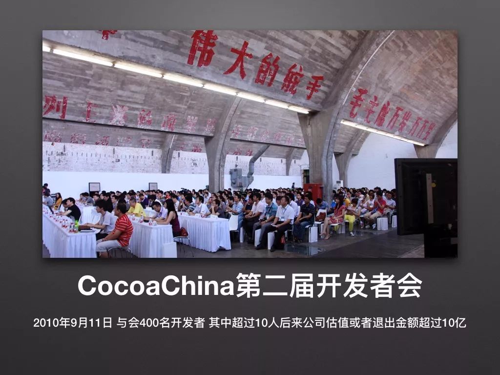 这是我们2010年9月11日 我组织的第一次开发者会也是CocoaChina的第二届开发者会这是7年半之前,而在这7年中,当年参会的超过10个人 公司在后来融资及并购的估值超过10亿。我真心希望也许3年5年之后,在场有更多的人能超过他们所取得的成绩。