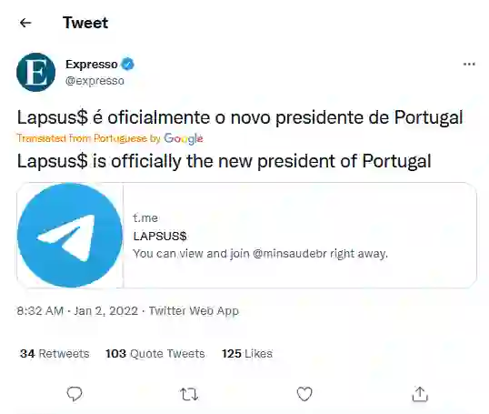 LAPSU$的攻击行径是从葡萄牙开始的。拿下葡萄牙最大的媒体综合体Impresa旗下的报纸Expresso的推特账户是LAPSU$的第一次出圈事件。