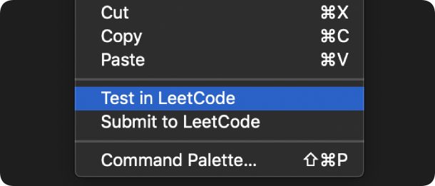 在编辑区内右键并选择 Test in LeetCode,可对当前答案进行测试。