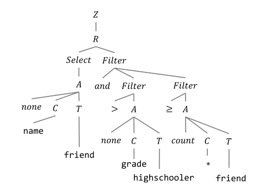 与SyntaxSQLNet类似,IRNet定义了一系列的CFG文法,将SQL转发为语法树结构。可以将其看作一种自然语言与SQL语句间的中间表示(作者称之为SemQL),整个parsing的过程也是针对SemQL进行的。如图所示: