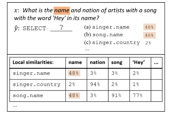 除此之外,该团队还提出了一种基于全局信息重排序的做法。首先先看下面这个例子,我们不知道name到底指向的是singer还是song,但是我们可以观察到nation只在singer中出现,所以应该是singer.name。这样做globalreasoning,就能减小歧义性。