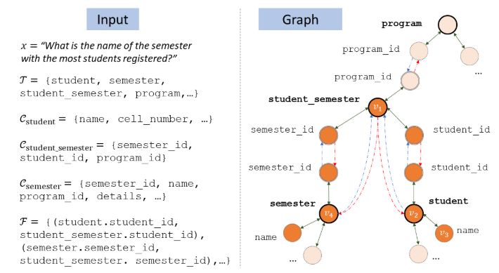 图9 左:模型输入样例(问题、表名、列名、主外键关系)