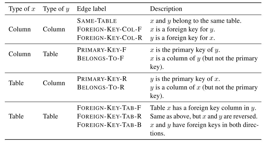 该工作可以看作图网络GNN的后续工作,作者在Table、Column、Question三者之间定义了更多的边(共33种),是目前榜单上的最强模型。