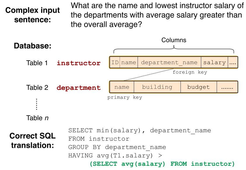 在这里,我们给出Text-to-SQL任务一个相对正式的定义:在给定关系型数据库(或表)的前提下,由用户的提问生成相应的SQL查询语句。下图是一个具体的实例,问题为:有哪些系的教员平均工资高于总体平均值,请返回这些系的名字以及他们的平均工资值。可以看到该问题对应的SQL语句是很复杂的,并且有嵌套关系。