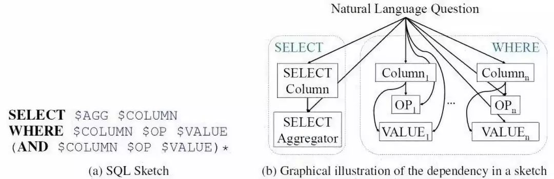 为了解决Seq2SQL使用强化学习效果不明显的问题,SQLNet将SQL语句分成了SELECT和WHERE两个部分,每个部分设置了几个槽位,只需向槽位中填入相应的符号即可。