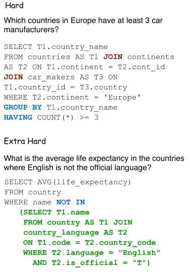 图2 Spider数据集中Hard以及Extra Hard难度的样例