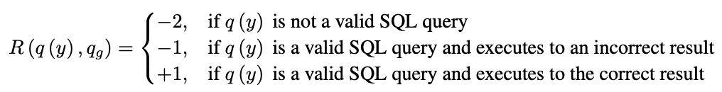 这可能导致原本正确的输出被判断为错误的。于是作者提出利用强化学习基于查询结果来进行优化。在解码器部分,对可能的输出进行采样,产生若干个SQL语句,每一句表示为y=[y1, y2 ... yT],用打分函数对每一句进行打分: