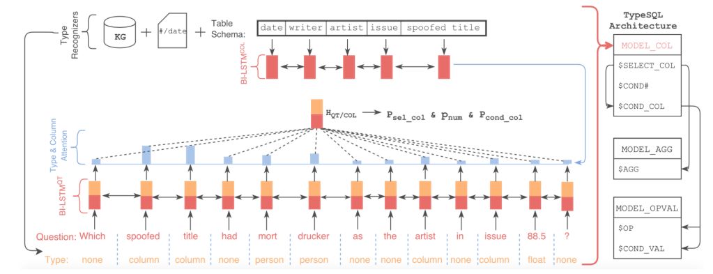 该模型基于SQLNet,使用模版填充的方法生成SQL语句。为了更好地建模文本中出现的罕见实体和数字,TypeSQL显式地赋予每个单词类型。