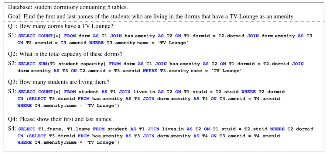 耶鲁大学的研究团队后续又推出了SParC,即Spider的上下文相关版本。数据库基于Spider,模拟了用户进行数据库查询的过程:用户通过若干条相关的提问最后达到一个最终查询目的。