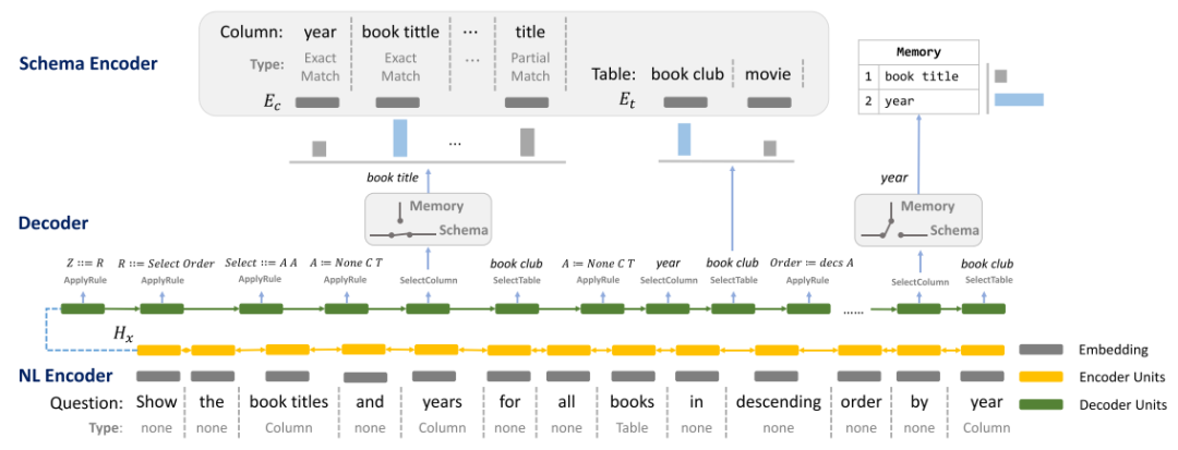 相比于之前decoder输出一段线性的文本,SyntaxSQLNet将解码的过程引入了结构性信息,即解码的对象为SQL语句构成的树结构。通过该技术,模型的精确匹配率提高了14.8%。