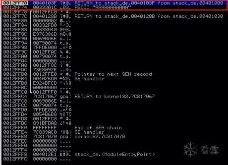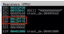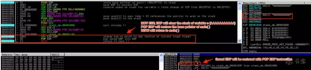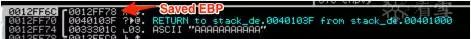 如您所见,执行的第一条指令是MOV ESP,EBP,它将EBP的值放入ESP中,因此它现在指向0012FF6C,并从栈中删除变量c(AAAAAAAAAAA)。栈顶部现在包含已保存的EBP: