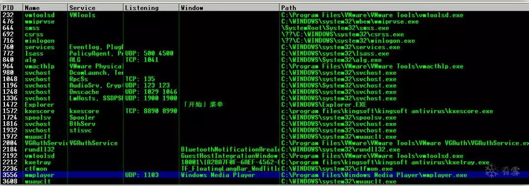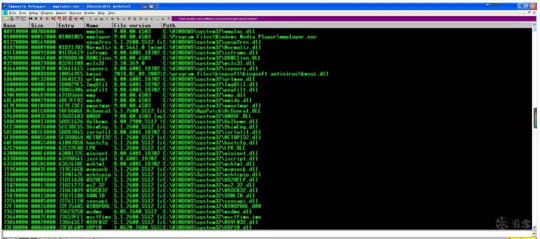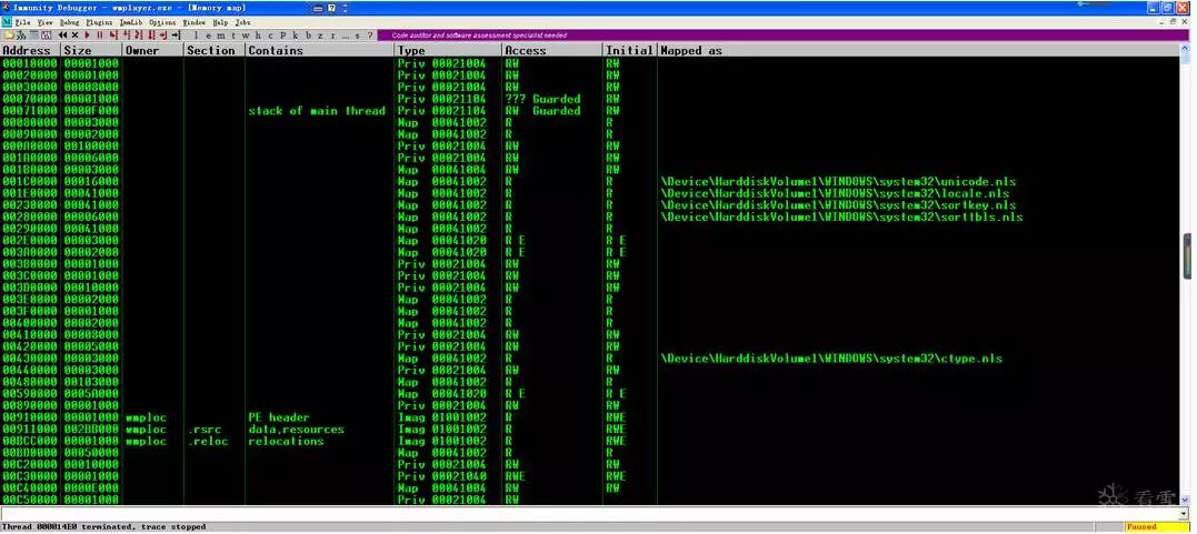 首先,在Windows Media Player附带Immunity后,按ALT + M查看内存映射(也可以选择View-> Memory或单击工具栏上的'M'图标)。