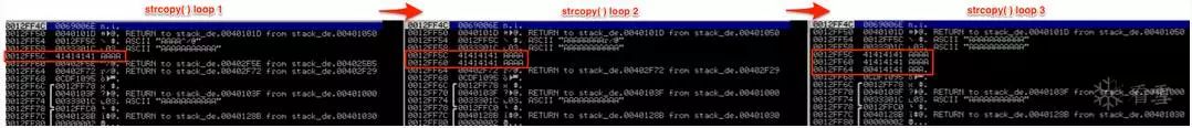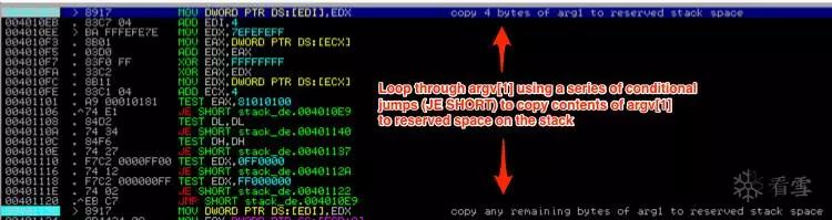 在下面的屏幕截图中,您会注意到它会继续遍历argv [1]的值,写入栈中(从c缓冲区的起始地址往下),直到写入完所有的argv [1]到栈。
