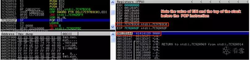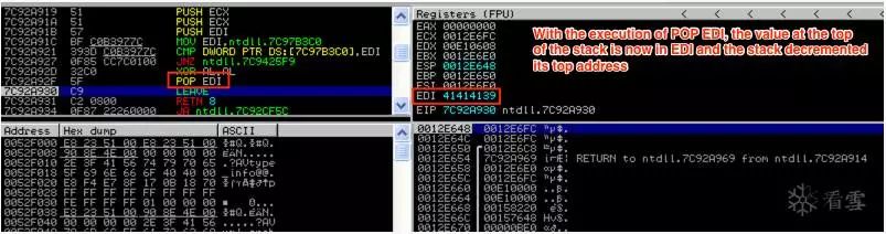 现在,来自EDI(41414139)的值被推到栈顶,列表中的下一条指令即将被执行(一条MOV指令),并且EDI的值被改变。让我们跳到POP EDI指令来显示如何从栈中取出数据。在这种情况下,栈顶部的当前值(41414139)将被弹出并放入EDI中。