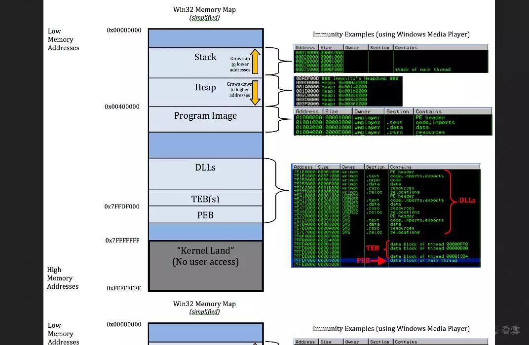 这是wmplayer.exe的内存布局,包括堆栈,堆,加载的模块(DLL)和可执行文件本身。我将使用在Corelan 关于基于堆栈溢出(Stack Based Overflows)的绝佳入门教程(已失效)中找到的内存映射的一个稍微简化的版本,详细介绍每个这些条目,具体条目已对应到Windows Media Player的Immunity内存映射。