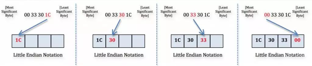 您会看到向后写入的内容为1C303300。让我借此机会快速介绍Little Endian。“字节顺序”是指字节存储在内存中的顺序。基于Intel x86的系统使用Little Endian,它在最小的存储器地址处存储值的最低有效字节(这就是为什么地址以相反顺序存储的原因)。