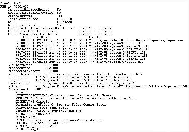 运行程序/应用程序时,会运行称为进程的可执行文件实例 。每个进程提供运行该程序实例所需的资源。每个Windows进程都有一个执行进程(EPROCESS)结构,其中包含进程属性和指向相关数据结构的指针。尽管这些EPROCESS结构中的大多数都驻留在Kernel Land中,但进程环境块(PEB)驻留在用户可访问的内存中。PEB包含有关正在运行的进程的各种用户模式参数。您可以使用WinDbg通过发出!peb命令轻松检查PEB的内容。