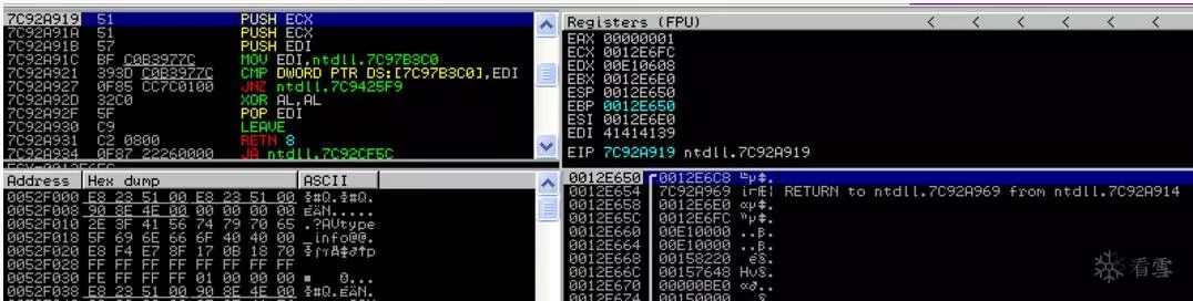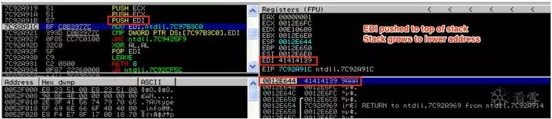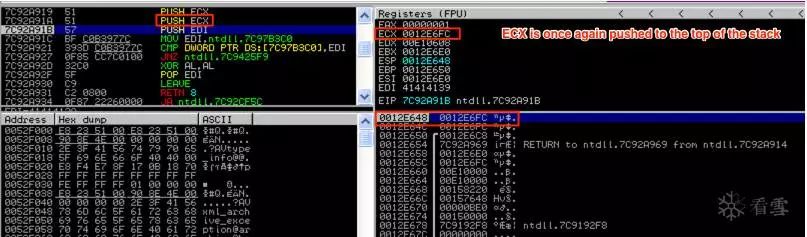 再一次,ECX(0012E6FC)的值被推到栈顶,ESP将其值再调整4个字节,正如你在上面的屏幕截图中看到的那样,最后的PUSH指令(PUSH EDI)即将执行。